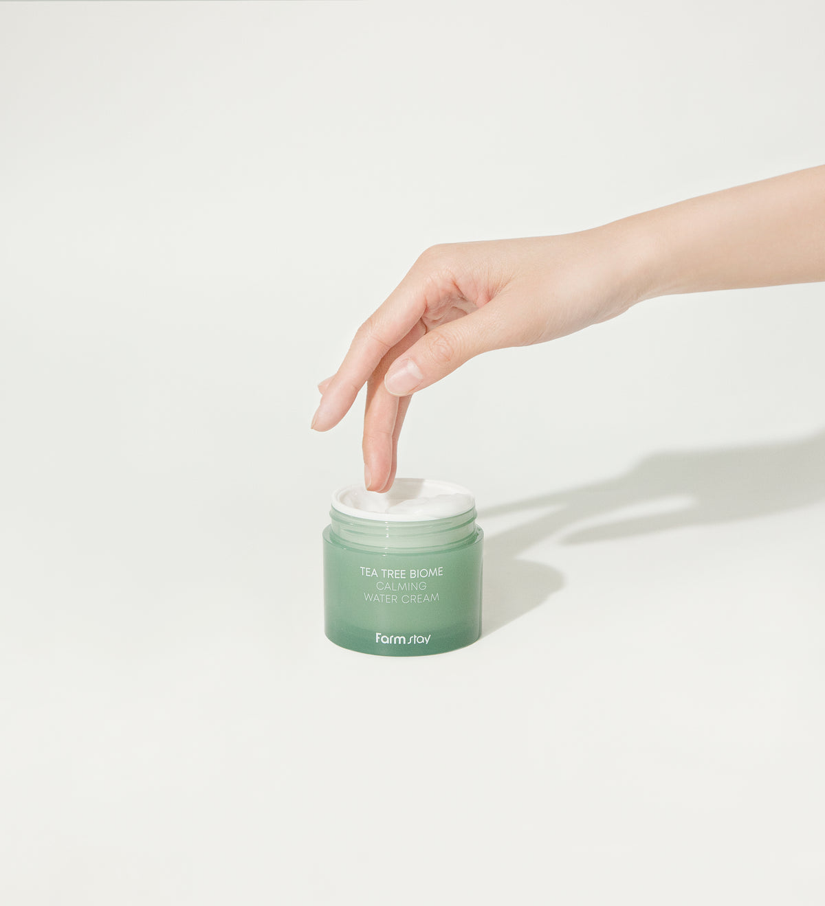 Farmstay Tea Tree Biome Calming Water Cream is a lightweight, refreshing moisturizer designed to hydrate, soothe, and balance the skin without heaviness. Infused with tea tree extract, tea tree leaf oil, and a probiotic complex (biome), it works to calm irritation, control excess sebum, and strengthen the skin barrier. Its water-based gel texture absorbs quickly, delivering instant moisture while leaving a fresh, non-greasy finish.